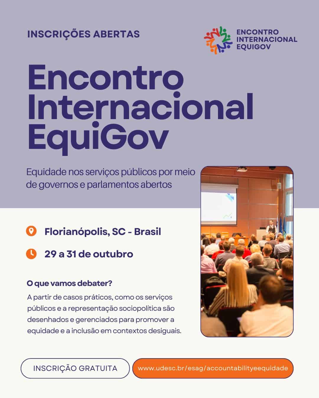 As inscrições para o Encontro Internacional EquiGov, sobre equidade nos serviços públicos por meio de governos e parlamentos abertos, podem ser feitas gratuitamente até esta sexta-feira, 25, no site udesc.br/esag/accountabilityeequidade. O encontro será em Florianópolis, na Assembleia Legislativa (Alesc) e na Universidade do Estado de Santa Catarina (Udesc), de 29 a 31 de outubro. As palestras terão tradução simultânea (português-inglês-espanhol).