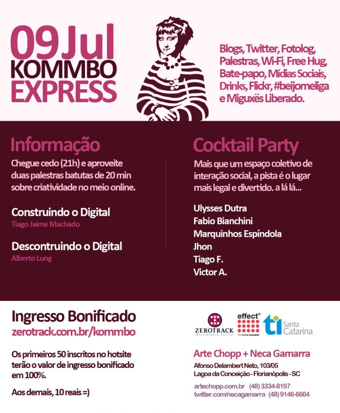 O evento será às 21h na Arte Chopp, chopperia e bruschetteria localizada na Lagoa da Conceição em Florianópolis – Rua Afonso Delambert Neto, 103/05. Inscrições e mais informações no site http://www.zerotrack.com.br/kommbo.