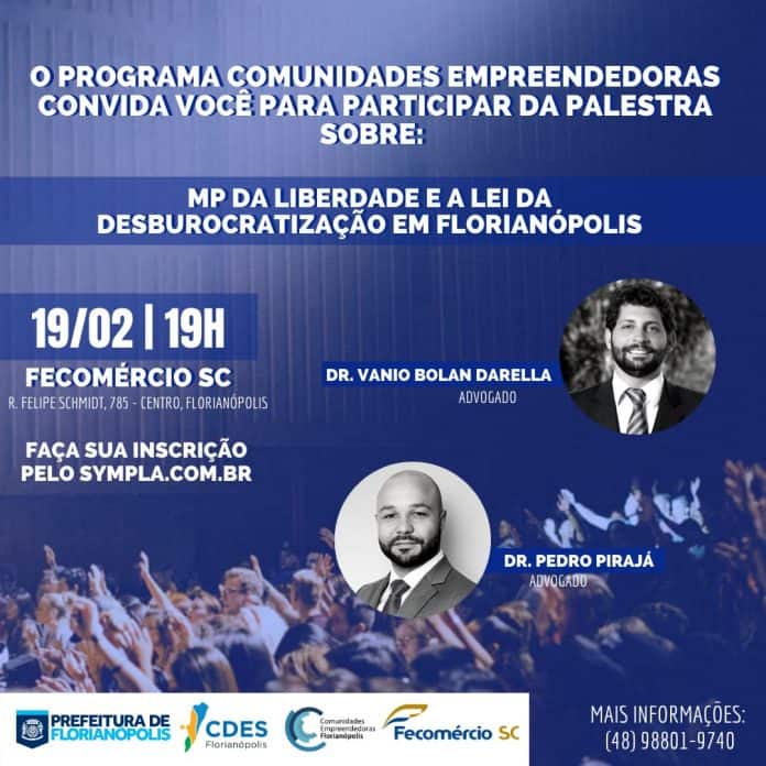Os advogados Vânio Bolan Darella e Pedro Pirajá vão explicar os detalhes das leis do Governo Federal e da Prefeitura de Florianópolis. “Ainda há muita dúvida em relação ao que pode fazer ou não, então é uma forma de prestar informação do que essas leis vão alterar na vida dos empreendedores”, explica o secretário de Desenvolvimento Econômico de Florianópolis, Thiago Chaves.