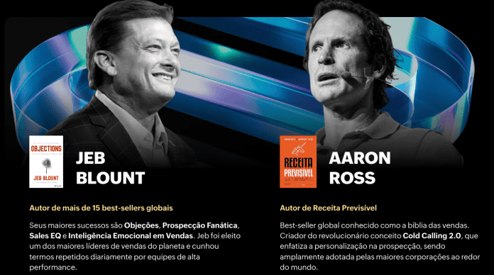 - Jeb Blount (Prospecção Fanática, Objeções, Sales EQ, The AI Edge): referência mundial em vendas, Jeb aborda técnicas modernas para superar objeções e desenvolver relacionamentos comerciais sólidos. Seus livros são manuais indispensáveis para equipes de alta performance. No evento, sua palestra vai abordar o tema do livro The AI Edge, lançado mundialmente em setembro deste ano, e que fala sobre o impacto da IA nas vendas.