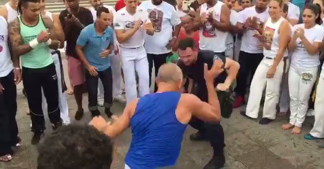 Um agente da Guarda Municipal de Florianópolis resolveu interagir com o pessoal que promovia uma roda de capoeira em frente ao TICEN, na semana passada.