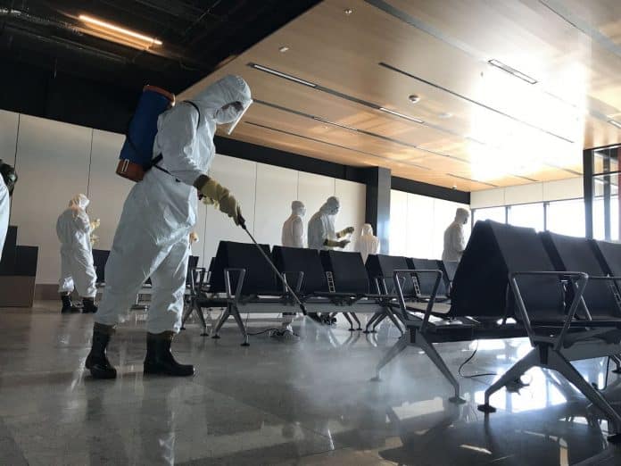Foram utilizados 5 mil litros de produto desinfectante, o mesmo utilizado em hospitais, aplicado por meio de bombas costais e borrifadores. Os militares tiveram que usar macacões de proteção química, luvas, máscaras, óculos e botas. O foco neste primeiro momento foram as salas de embarque e desembarque.
