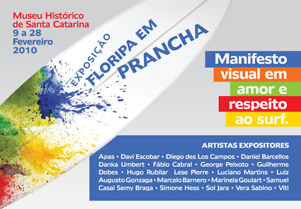 A Exposicão Floripa em Prancha, será inaugurada nesta terça-feira, 09/02, no Museu Histórico de Santa Catarina, na praca XV de novembro, no centro de Florianópolis. A Mostra conta com vários artistas conhecidos em Santa Catarina, dentre eles Vera Sabino, George (Picolé) Peixoto, Fábio Cabral, Danka Umbert, Luciano Martins, Simone Hess.