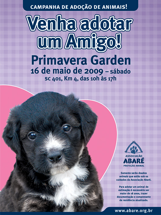 “As Feiras de adoção são eventos realizados para conhecer e receber um novo membro na família. É também uma excelente oportunidade de passear e conhecer, quem sabe um novo amigo. Você brinca com os animais, recebe dicas de adestramento, conversa e aprende com os educadores da Abaré”, explica Núbia Moreira Brodbeck, presidente da Abaré.