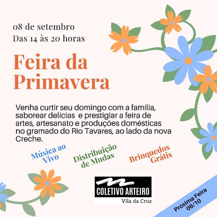 Neste domingo, 8, tem Feira da Primavera no gramado do Rio Tavares, entre a nova creche e a Pedrita, na SC-406. Das 14h às 20h vai ter atrações musicais, opções de lazer, brinquedos, exposição de produtos artesanais dos expositores do Coletivo Arteiro Vila da Cruz e distribuição de mudas de árvores doadas pela Pedrita. Entre as espécies que estarão à disposição da comunidade haverá pitanga, araçá e grumixama cultivadas no próprio horto da empresa.