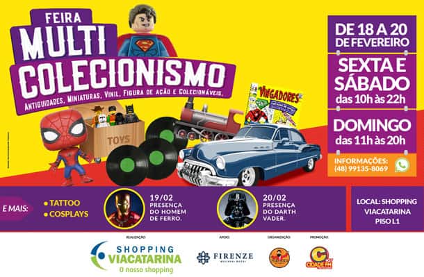 De 18/02 a 20/02, acontece no shopping ViaCatarina a Feira Multi Colecionismo com exposição e venda de miniaturas, feira de vinil, figuras de ação, moedas, gibis e colecionáveis. Atrações especiais serão as performances pelos pisos dos bonecos do Homem de Ferro (sábado) e Darth Wader (domingo). Haverá também a discotecagem do DJ Márcio da Noite do Vinil nos três dias de evento, que segue todos os cuidados de segurança e higienização necessários no combate ao coronavírus, com acesso gratuito para todas as idades.