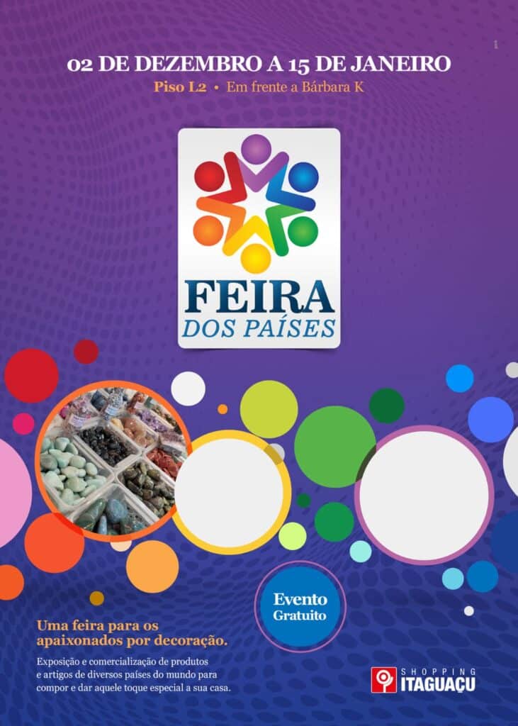 A Grande Florianópolis poderá conferir de perto a cultura e trabalhos artesanais diferenciados dos quatro cantos do mundo, até dia 15 de janeiro, na Feira dos Países. A feira internacional de artesanato original, traz para a praça de eventos, no Piso L2, do Shopping Itaguaçu, mais de 10 mil itens de altíssima qualidade, para que todos possam ter em casa trabalhos exclusivos do seu país favorito.