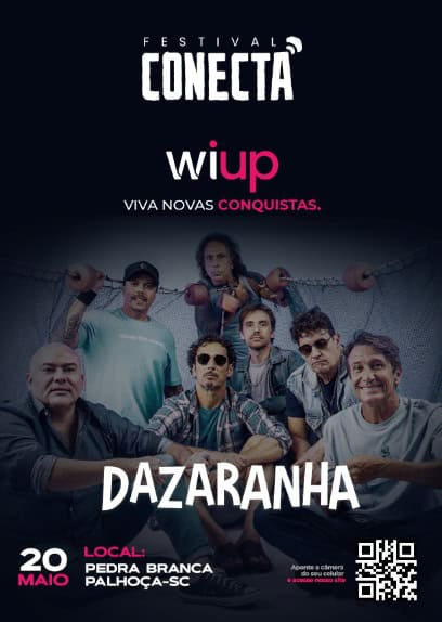 banda Dazaranha é a atração principal da 1ª edição do Festival Conecta e  promete reunir seu animado e fiel público nesta sexta-feira (20), às 19h, no Passeio Pedra Branca. O evento marca o lançamento da  WiUp Fibra, um novo provedor de internet com atuação em Palhoça, que chega ao mercado com o objetivo de oferecer serviços especializados, com alta qualidade e atendimento humanizado. O show é gratuito.