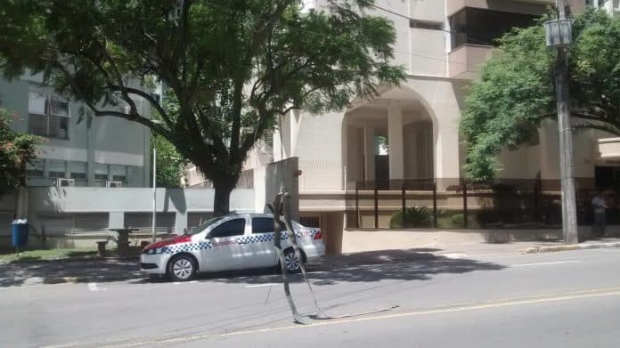 Em frente à entrada da emergência do Hospital Celso Ramos, um conjunto de fios que parece ter se desprendido da ligação entre dois postes está arrastando no chão.