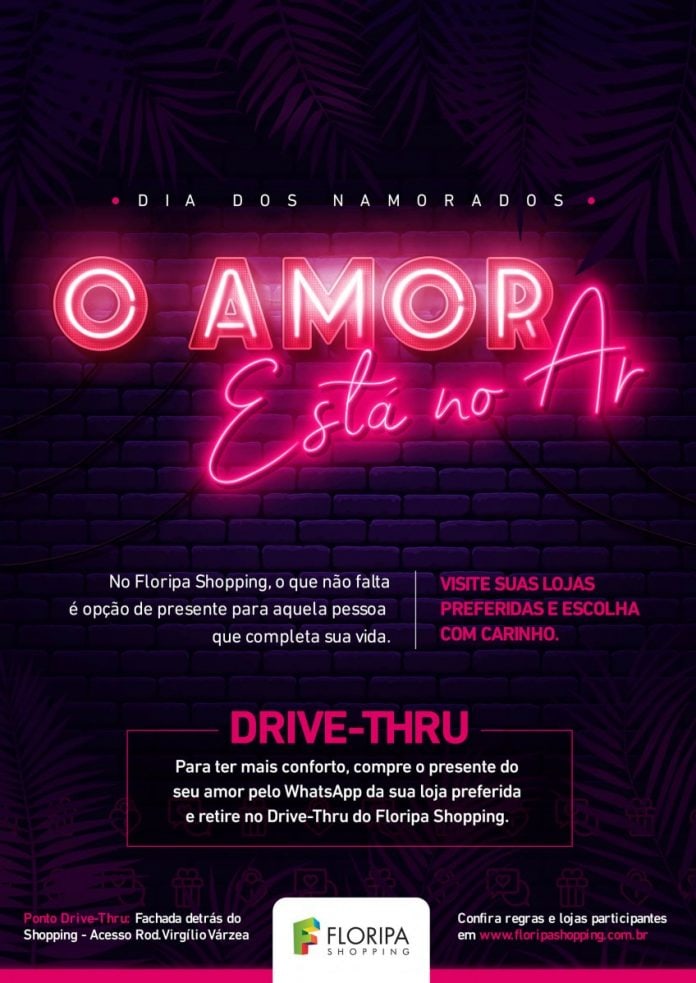 O comércio em geral já está preparado com diversas opções de presentes para o Dia dos Namorados e o Floripa Shopping, localizado na SC 401, traz algumas operações diferentes para ninguém deixar de presentear o amado ou amada, nesse dia tão especial. O modelo de compra Drive-Thru onde o cliente tem uma opção de compra segura e sem sair do carro, o delivery para receber o produto no conforto de casa e ainda a forma presencial para quem prefere ir pessoalmente ao empreendimento.