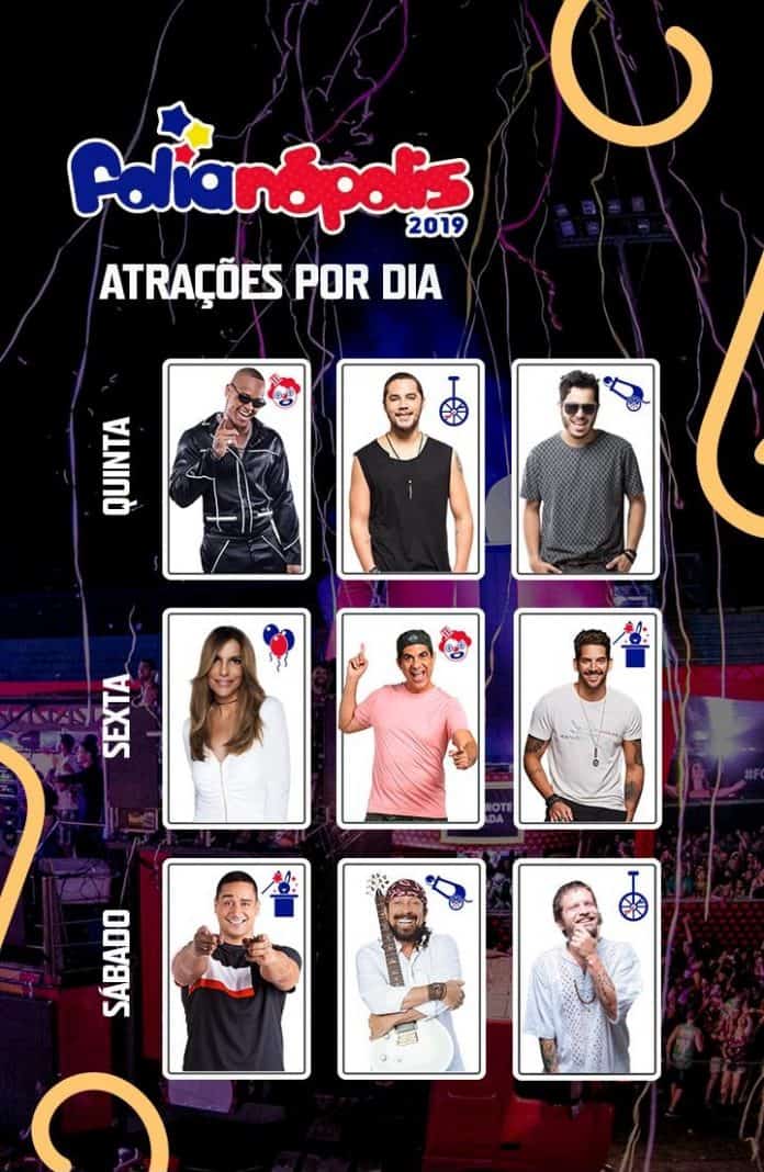 14/11, quinta-feira – O Folianópolis 2019 chega com tudo com o “gigante” Léo Santana, que atualmente divulga sua música Contatinho, com participação de Anitta. A primeira noite também conta com a banda Jammil, que acaba de retornar de uma turnê pelos Estados Unidos, e com o cantor Tomate, que na última edição do evento fez uma apresentação de mais de três horas, levando os micareteiros à loucura.
