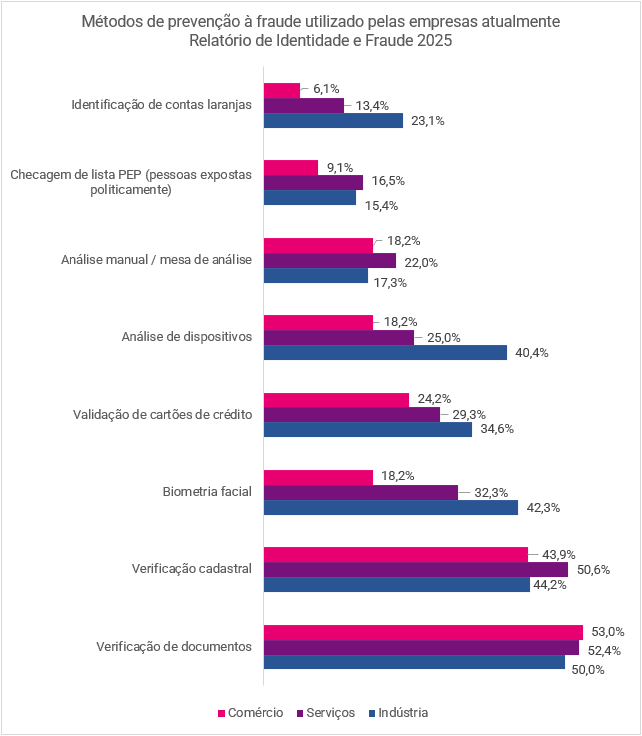 Os métodos mais tradicionais seguem predominando nas estratégias de defesa: verificação de documentos (51,6%) e análise cadastral (47,1%) ainda são os mais utilizados. Contudo, outras soluções vêm ganhando espaço, como biometria facial (29,1%) e análise de dispositivos (25%). O setor industrial, por exemplo, lidera a adoção da biometria, com 42,3%. A consistência na escolha de mecanismos de segurança entre diferentes segmentos reforça um movimento coletivo de adaptação, ainda que em velocidades distintas.