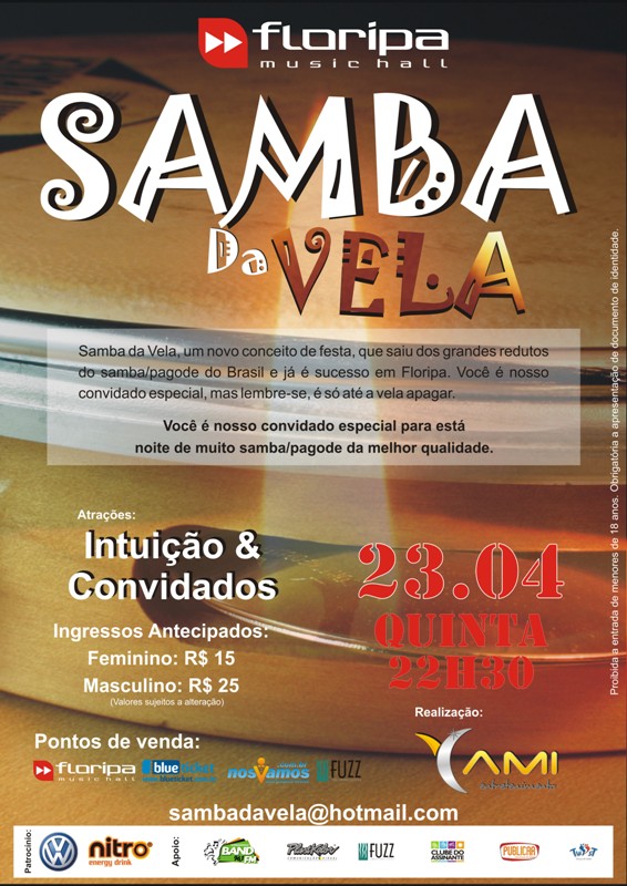 Na próxima quinta-feira, 23 de abril, acontece a terceira edição do Samba da Vela, projeto que vem conquistando os amantes do bom samba e pagode da Grande Florianópolis. Originária dos grandes redutos do samba/pagode de São Paulo, o Samba da Vela chega à capital com o mesmo conceito: ao acender a vela dá-se inicio ao samba, que só acaba quando a chama se apagar. Na próxima quinta-feira quem sobe no palco do Floripa Music Hall é o Grupo Intuição, que já tem como convidado confirmado o Grupo Entre Elas. A festa começa a partir das 22h30 e os bônus desconto podem ser solicitados pelo e-mail sambadavela@hotmail.com. Maiores informações (48) 84087074.