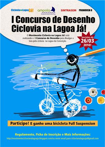 O Concurso de Desenho “Ciclovia na Lagoa Já!” está sendo promovido pelo MOVIMENTO CICLOVIA NA LAGOA JÁ!, AMPOLA (Associação dos Moradores do Porto da Lagoa) e SINTRASEM (Sindicato dos Trabalhadores no Serviço Público Municipal de Florianópolis) com o objetivo de divulgar a luta pela realização da ciclovia que interligará a rua Osni Ortiga com o TILAG.
