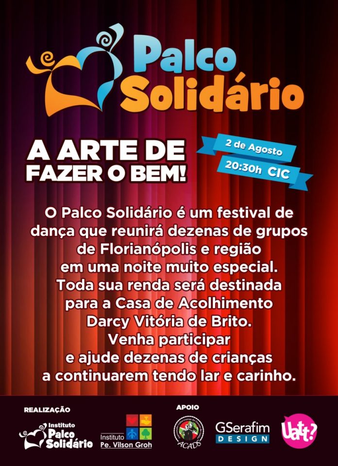Estão a venda os ingressos para a primeira edição do Palco Solidário, evento que vai reunir cerca de 100 dançarinos, no dia 2 de agosto, no Centro Integrado de Cultura (CIC), em um espetáculo produzido para beneficiar a Casa de Acolhimento Darci Vitória, de Florianópolis. Os ingressos entecipados custam R$ 30 e podem ser adquiridos nas escolas de dança participantes da Associação Catarinense de Dança de Salão (ACADS). As entradas podem ser solicitadas também pelo telefone (48) 9962.7811.