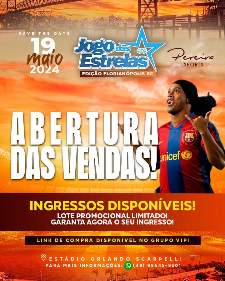 Um dos assuntos mais comentados em Florianópolis nos últimos dias é a presença de Ronaldinho Gaúcho no Jogo das Estrelas, que será realizado no próximo dia 19 de maio, às 15 horas, no estádio Orlando Scarpelli.