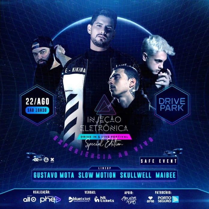 Inspirado em grandes referências da cena, o caminho encontrado para a edição da Injeção Eletrônica foi o modelo híbrido, que consiste na realização do evento, simultaneamente, in loco e online. A edição que ocorre no Drive Park, no sábado, dia 22 de agosto, também será transmitida pelo YouTube, com uma super estrutura para que o público possa sentir de casa a experiência que o festival irá proporcionar. O line up será formado por Gustavo Mota, Slowmotion, SKULLWELL e Maibee.
