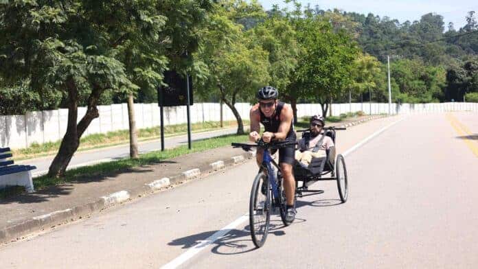Felipe conta que participou do IRONMAN em 2010 e parou por um tempo. Quando resolveu voltar, percebeu que precisava de uma motivação nova. “Inspirado na história do Dick/Rick Hoyt, decidi fazer algo parecido. Fui pesquisar em ONGs e conheci o trabalho do Pernas de Aluguel, que me mostrou o equipamento indicado, o caminho das pedras e me indicou o Jonatan. Aí começamos a treinar e estamos nessa rotina há dez meses”, explica.