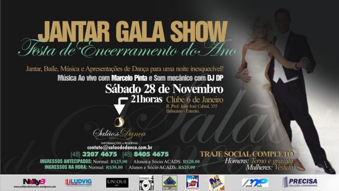 Neste sábado, dia 28 de novembro, 21h, no Clube Recreativo Seis de Janeiro, no Balneário do Estreito, em Florianópolis, o Salão de Dança – Ensino, Arte e Cultura promove o JANTAR GALA SHOW – Festa de Encerramento do Ano, com jantar, apresentações de dança de salão, música ao vivo com Marcelo Pinta e som mecânico com DJ DP (Daniel Pozzobon).
