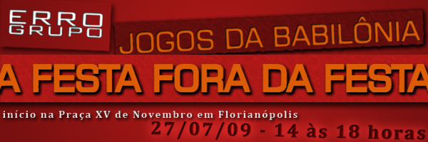 Festa fora de época, fora de hora, fora da ordem, fora de lógica, fora (boa, bem apelativo). Venha dançar na Babilônia! A Festa Fora da Festa é um convite para dançar ao som da Babilônia, um instante prolongado do acaso com inúmeras opções de deslizamentos e fenômenos naturais. Venha percorrer a Babilônia e celebrar o simples poder de caminhar feliz. (tá ruim isso). A Festa Fora da Festa propõe um percurso por pontos específicos delimitados no centro de Florianópolis acompanhados de set musicais específicos para cada local, pensando a musicalmente a arquitetura do local assim como seu fluxo (definir percurso e falar mais sobre ele).