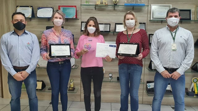A jornalista Eonir Malgaresi, repórter da TV da Epagri, foi a escolhida para representar Santa Catarina no Prêmio Confap de Ciência, Tecnologia & Inovação – Professor Francisco Romeu. Ela foi premiada na categoria Profissional de Comunicação. O anúncio foi feito pela Fundação de Amparo à Pesquisa e Inovação do Estado de Santa Catarina (Fapesc) em evento on-line realizado no dia 8 de outubro. A entrega do prêmio aconteceu quarta-feira, 13.A partir da esquerda: Vagner Portes, diretor de pesquisa da Epagri; Edilene Steinwandter; Eonir Malgaresi; Rosana Kokuszka, gerente de comunicação da Epagri; Carlos Edilson Orenha, gerente de pesquisa da Epagri