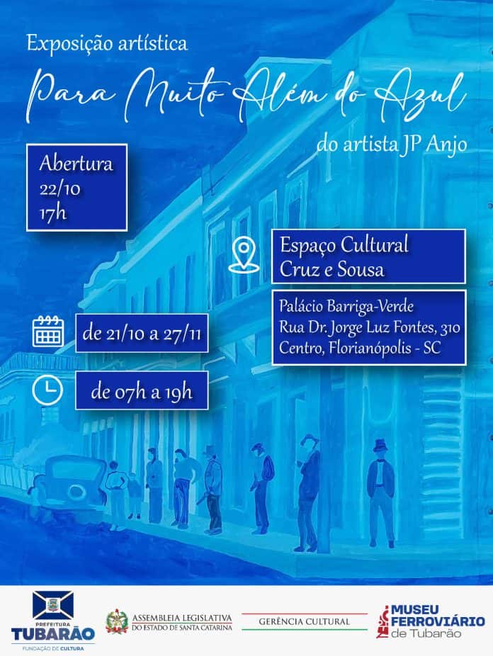 O artista visual tubaronense JP Anjo inaugura no dia 22 de outubro de 2025, às 17h, a exposição “Para Muito Além do Azul” na prestigiada Galeria Cruz e Souza, na Assembleia Legislativa do Estado de Santa Catarina (ALESC), em Florianópolis. A mostra ficará aberta para visitação até o dia 28 de novembro de 2025.