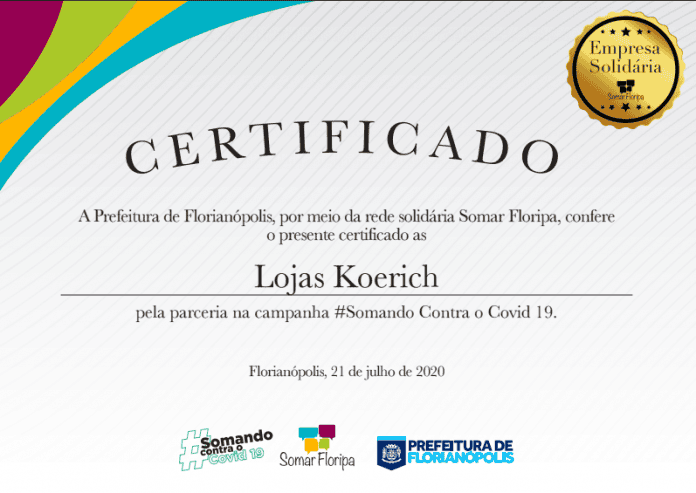 O Koerich, uma das mais tradicionais varejistas catarinenses, tem como premissa a atuação nas comunidades. A filosofia é fortemente defendida por seu presidente, o empresário Antonio Koerich e compartilhada junto aos colaboradores. Desde o início da pandemia, muitas ações foram desenvolvidas, principalmente no apoio a entidades e comunidades menos favorecidas e a implantação de programas de apoio a educação, bem como a doação de mais de 500 toneladas de alimentos doados para comunidades na Grande Florianópolis. Todo este trabalho agora foi reconhecido pela Somar Floripa, com certificado de empresa solidária pela parceria na campanha #Somando Contra o Covid 19. “Me orgulho do legado que estamos construindo junto a comunidade e também com nossos colaboradores. Nestes mais de 60 anos, sempre estivemos de forma ativa construindo relações e investindo na nossa gente," finaliza Antonio Koerich, presidente do Koerich.