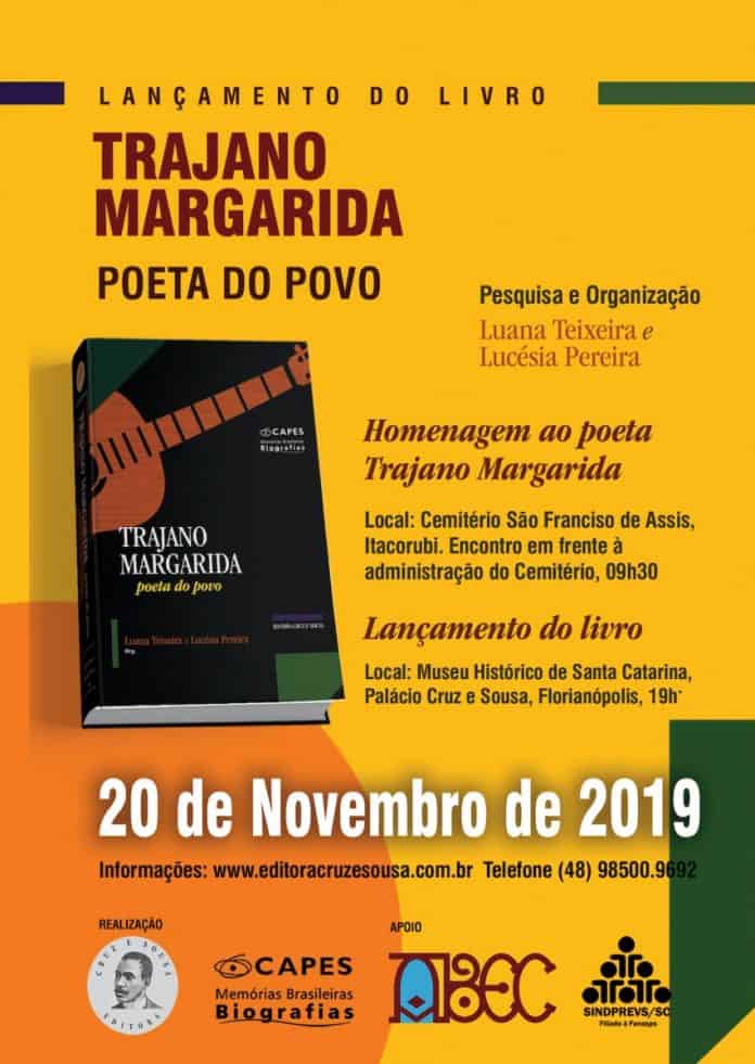 Trajano Margarida, poeta e músico de Florianópolis, nasceu em 1889, foi um importante representante das demandas da população negra, eleito duas vezes presidente do Centro Cívico e Recreativo José Boiteux. Sua obra é composta por poesias, versos, livretos, marchinhas de carnaval. Para rememorar seus escritos, o lançamento contará com um sarau de poesias do autor interpretadas pelo rapper Daniel DKG Dekilograma, organizador do Slam Continente, e também da cantora Jandira Souza.
