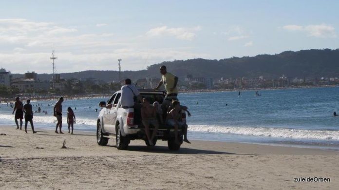 Duas infrações em uma imagem: o motorista de uma camionete com placas da Argentina foi flagrado circulando entre os banhistas na praia dos Ingleses, em Florianópolis, levando passageiros na carroceria do veículo.