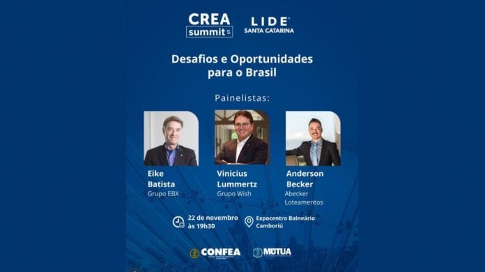 O LIDE Santa Catarina realiza, nesta quarta-feira (22), às 19h30, no Expocentro Balneário Camboriú, o painel “Oportunidades para um Brasil Grande” como parte da programação de abertura do CREA Summit 2024. O encontro contará com a participação de grandes nomes do cenário nacional, como Eike Batista, fundador do Grupo EBX; Vinicius Lummertz, ex-ministro do Turismo e representante do Grupo Wish; e Anderson Becker, presidente da Abecker Loteamentos.