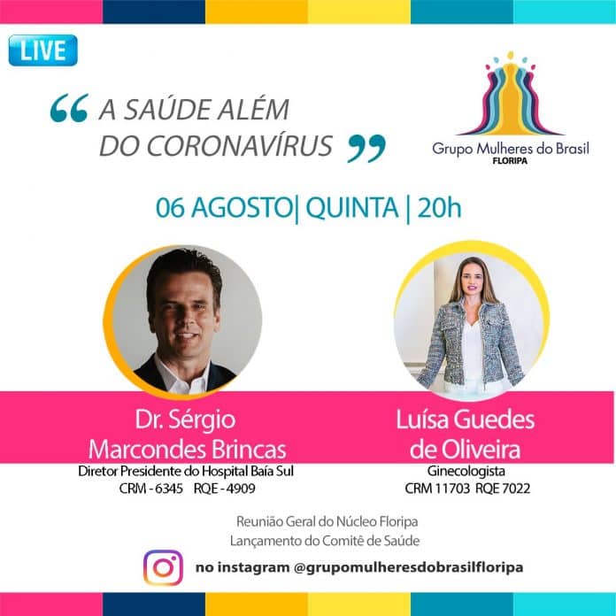 O Grupo Mulheres do Brasil Florianópolis comemora o lançamento do Comitê de Saúde com uma live no instagram sobre um tema alarmante: o número de pessoas em consultas médicas e exames preventivos diminuiu por conta do medo de contágio da Covid-19. A ginecologista Dra. Luisa Guedes, líder do novo comitê, e o Dr. Sérgio Brincas, médico e diretor presidente do Hospital Baía Sul e Clínica Imagem, estarão online (www.instagram.com/grupomulheresdobrasilfloripa/) no dia 6 de agosto, às 20h, para falar sobre os números preocupantes e o que isso pode acarretar para a saúde da população.