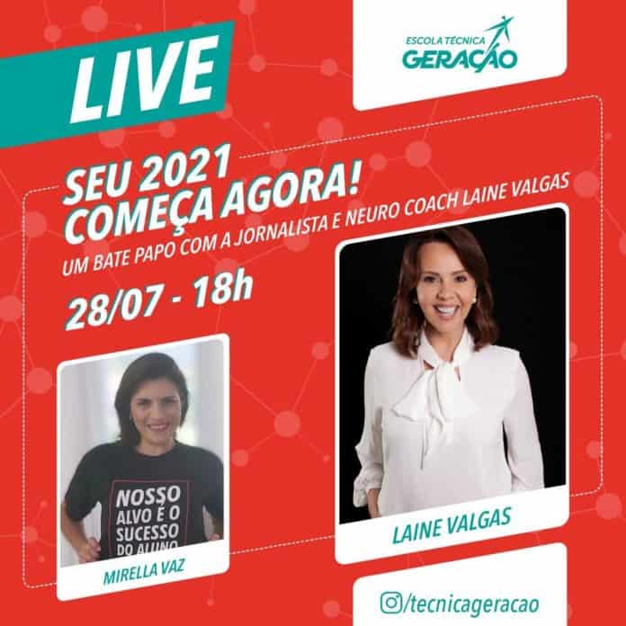 “Seu 2021 começa agora” é o tema da live que a jornalista e neuro coach Laine Valgas irá participar nesta terça-feira (28), a partir das 18h, no IG da Escola Técnica Geração – @tecnicageracao. Conduzida pela especialista em educação e analista comportamental Mirella Vaz, a live gratuita irá abordar sobre o melhor aproveitamento das oportunidades desse momento como diferenciação para o próximo ano. “O que plantamos hoje, sem dúvidas, irá determinar como será o próximo ano. Quem está em movimento, aproveitando as oportunidades, terá um 2021 com mais resultados”, destaca Ana Paula Calaes, CEO da Escola Técnica Geração e da Gera Emprego.  O evento será online e 100% gratuito.
