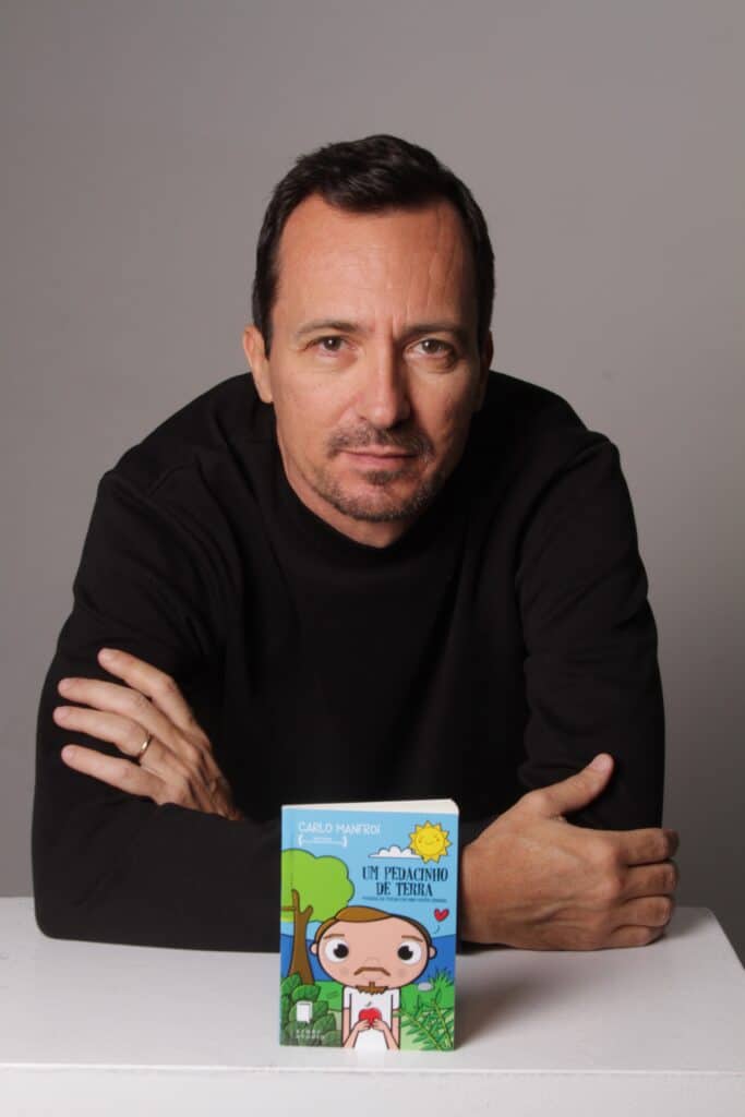 Autor Carlo Manfroi com o livro Um Pedacinho de Terra