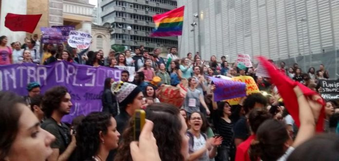 Centenas de mulheres se reuniram no fim da tarde desta sexta-feira, 6, em frente à Catedral Metropolitana, no Centro de Florianópolis, para uma manifestação organizada contra o presidente da Câmara Federal, Eduardo Cunha (PMDB-RJ) e seu Projeto de Lei 5069/2013.