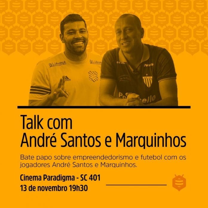 Dois jogadores que passaram pelos principais clubes do Estado se reúnem para falar de futebol e empreendedorismo, na quarta-feira, dia 13. Marquinhos, ídolo do Avaí, e André Santos, que atuou pelo Figueirense, participam de um bate papo gratuito no Paradigma Cine Arte, às 19h30. As inscrições podem ser feitas em sympla.com.br/bate-papo–andre-santos-e-marquinhos-futebol-empreendedorismo-e-mais__703037