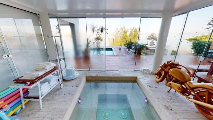 A casa foi projetada pelos renomados arquitetos Marchetti e Bonetti em quatro níveis com amplos ambientes e vista livre para a natureza, seis suítes, banheiros em mármore grego, móveis em madeira pinho-de-riga, adega e elevador, entre outros diferenciais do mais alto padrão de sofisticação. Ainda, conta com área clube completa com piscina aquecida de borda infinita, hidromassagem, sauna, sala fitness, minicampo de futebol, brinquedoteca, jardim, espaço gourmet com churrasqueira e até horta. E o proprietário e seus visitantes podem chegar por terra, água ou ar, pois o condomínio conta com clube náutico e heliponto.