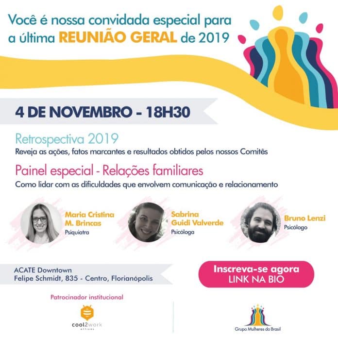 O último encontro de 2019 do Grupo Mulheres do Brasil na Capital terá uma temática especial. Além de apresentar uma retrospectiva sobre os projetos e ações realizadas pelo Grupo, o encontro vai receber a psiquiatra Maria Cristina Brincas e os psicólogos Sabrina Valverde e Bruno Lenzi para um bate papo sobre Relações Familiares – Como lidar com as dificuldades que envolvem a comunicação e relacionamento.  O evento será realizado no dia 4 de novembro, às 18h30, no Cool2work Acate Downtown, no Centro.