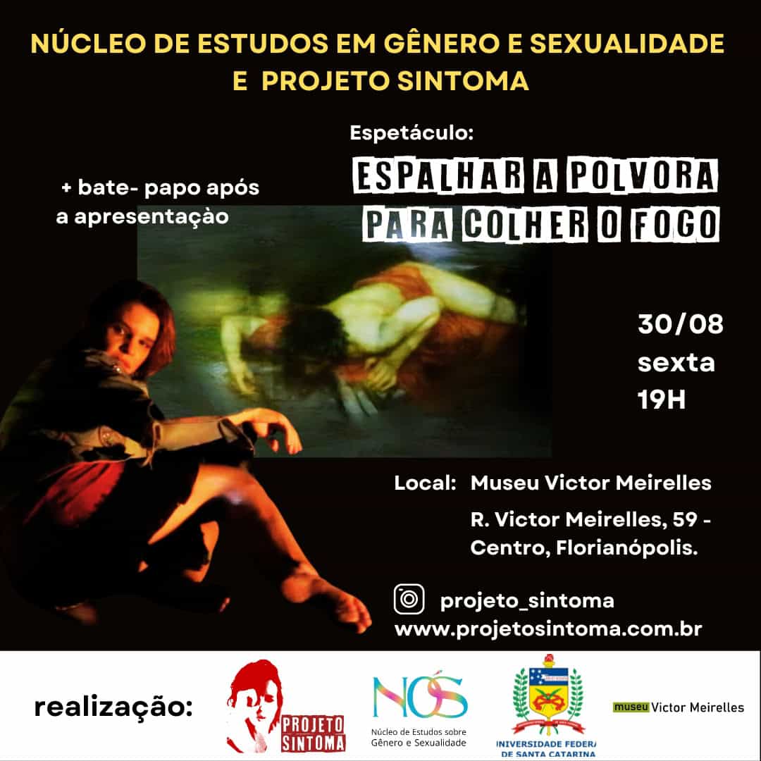 O auditório do Museu Victor Meirelles (Ibram/MinC) será palco do espetáculo “Espalhar a pólvora para colher o fogo”, seguido de bate-papo com a atriz Monica Siedler, às 19h desta sexta-feira, 30 de agosto de 2024. A apresentação, com entrada gratuita, é uma atividade de extensão do Centro de Ciências da Educação da Universidade Federal de Santa Catarina organizada pelo Núcleo de Estudos Sobre Gênero e Sexualidade (NÓS/CED/UFSC) e pelo Projeto Sintoma.