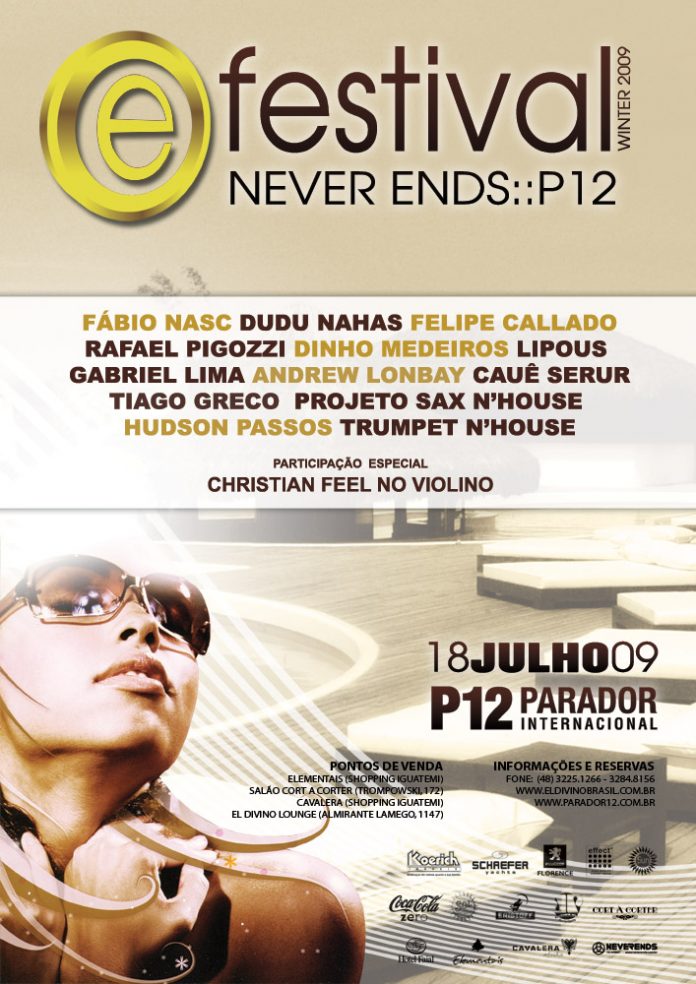 Próximo sábado, dia 18 de julho, a partir das 12h, a Agência de Djs Never Ends, promove no P12 – Parador Internacional (Costão de Jurerê) o E-Festival Never Ends, reunindo os artistas de maior expressão na cena eletrônica do Estado. O line up com 8 horas de duração contará com a apresentação dos Dj’s Dinho Medeiros, Dudu Nahas, Felipe Callado, Rafael Pigozzi, Gabriel Lima, Hudson Passos, Lipous, Andrew Lonbay, Cauê Serur, Tiago Greco, Fábio Nasc, Projeto Sax N House e Trumpet N House com participação especial de Christian Feel no violino.