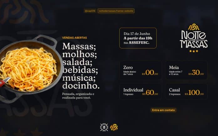 Está chegando mais uma noite que promete deixar muita gente com água na boca. Na dúvida, vale provar um pouco de cada. A tradicional Noite de Massas, que acontece no próximo dia 17 de junho, na ASSEFESC (Associação dos Servidores da Secretaria da Fazenda do Estado de Santa Catarina) é um evento beneficente do Capítulo Hercílio Luz, para arrecadar fundos para projetos filantrópicos.
