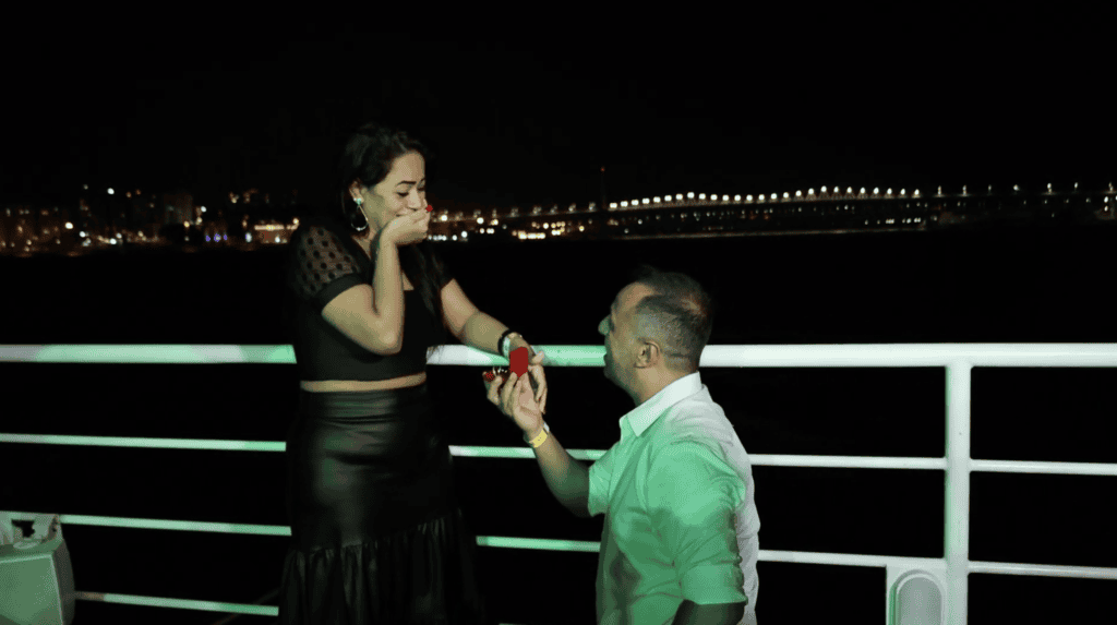 Fotos do casal de empresários também foram exibidas na tela. A bordo do Catamarã, com balões vermelhos, e ao som de violino, o clima à beira-mar ficou ainda mais romântico quando surgiu a surpresa maior. A Megatela Floripa Square brilhou o pedido “Casa Comigo?” surpreendendo ainda mais a noiva e a todos que faziam o passeio junto com o casal, que namora há um ano.