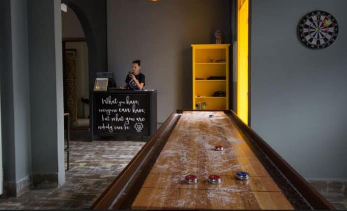 Foi em uma viagem para a Las Vegas que as sócias a frente da mais nova cervejaria de Florianópolis conheceram a mesa de Shuffleboard. O jogo, simples e cativante, proporciona interação (e boas risadas!) para todos os públicos, de diferentes idades. É simples de jogar, sem exigir experiência.