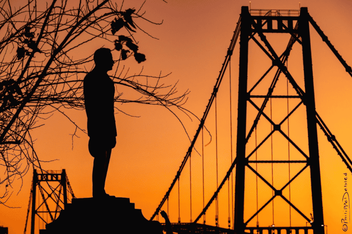 Estátua de Hercílio Luz olhando para sua criatura, a ponte Ponte Hercílio Luz em Florianópolis, a maior ponte suspensa do Brasil, com 821 metros