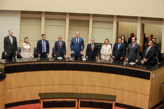A Assembleia Legislativa realizou uma sessão especial em homenagem aos 90 anos da OAB/SC na noite desta segunda-feira (7/8), fruto de uma proposição do deputado Ivan Naatz. A presidente da Seccional, Cláudia Prudêncio, recebeu uma placa alusiva ao aniversário e a todo o trabalho prestado há anos pela instituição e pelos advogados e advogadas do Estado. Mais de 40 Subseções da OAB/SC estiveram representadas por seus presidentes e diretores, e também receberam certificados. Antecedendo a sessão, Cláudia recebeu em seu gabinete autoridades e os presidentes das Subseções presentes para um momento de confraternização e troca de ideias. Dentre os presentes, diretores da Seccional, desembargadores Osmar Nunes e Altamiro de Oliveira, e o procurador-geral de Justiça, Fábio de Souza Trajano.