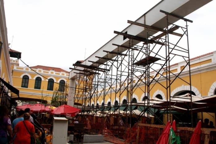 As obras de instalação da cobertura do vão central do Mercado Público, em Florianópolis, seguem em ritmo acelerado, tendo o segundo carregamento de peças metálicas chegado neste domingo, 3. As informações são da assessoria de imprensa da PMF.