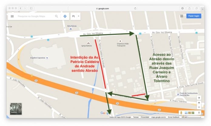 A interdição será feita na Avenida Patrício Caldeira de Andrade entre o Elevado da Avenida Ivo Silveira, com o retorno de acesso ao Supermercado Angeloni, conforme imagem abaixo.