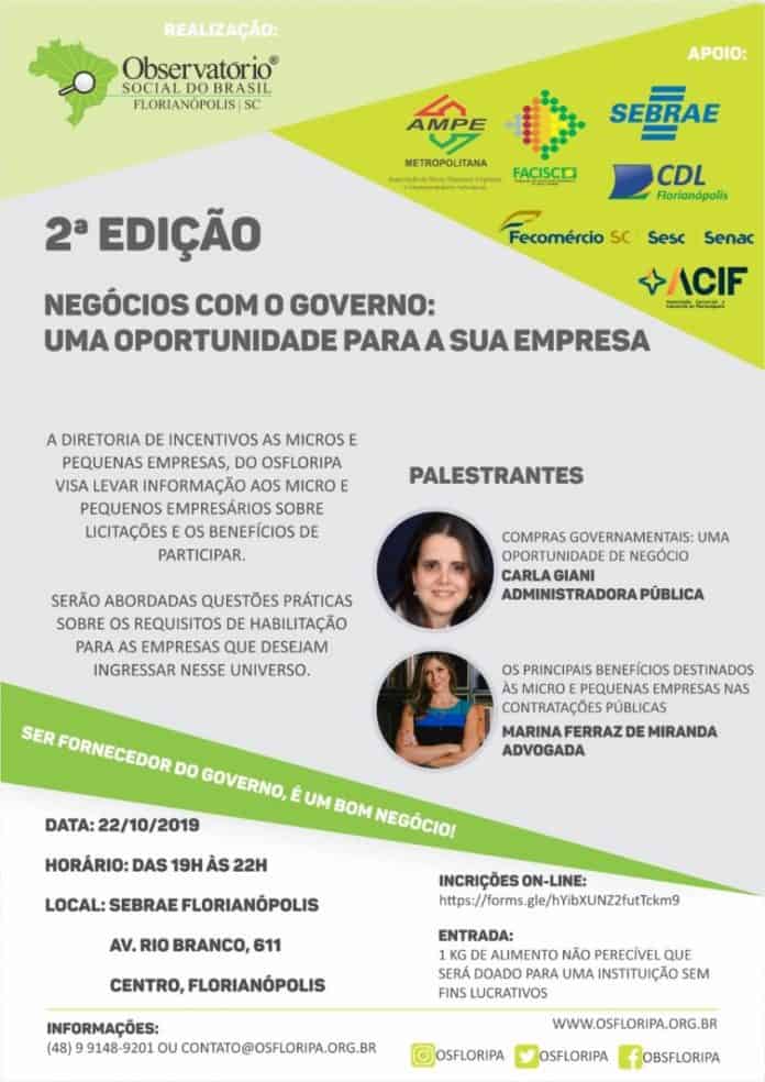O Observatório Social de Florianópolis (OSF) promove no dia 22, terça-feira, a segunda edição do evento “Negócios com o Governo – uma oportunidade para sua empresa”. O encontro ocorre a partir das 19h, na sede do Sebrae, e vai orientar empresários de micro e pequeno porte sobre como participar de licitações públicas.