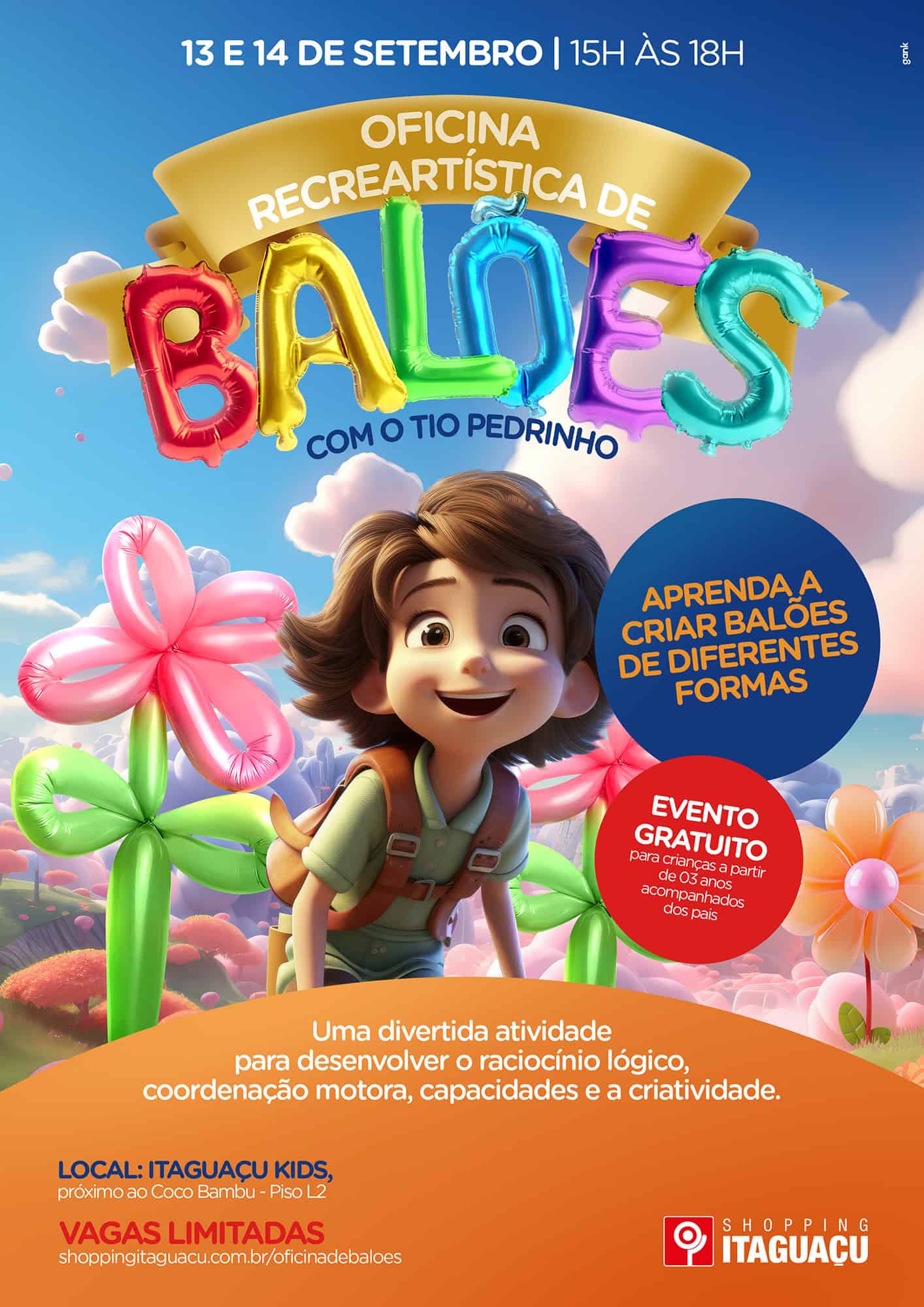 O Shopping Itaguaçu convida crianças e responsáveis a participarem de uma atividade que vai transformar o espaço Itaguaçu Kids em um ambiente de criatividade e diversão. Inspirada na Primavera, a Oficina Recreartística de Balões comandada pelo Tio Pedrinho promete uma experiência lúdica e educativa, onde os pequenos irão explorar o universo artístico de maneira divertida e segura aprendendo a fazer esculturas com balões. O evento gratuito ocorre nos dias 13 e 15 de setembro, no Piso L2, das 15h às 18h.