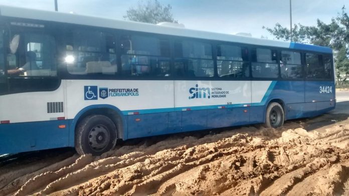 Um veíclo do transporte público de Florianópolis ficou atolado no estacionamento do Terminal de Integração do Centro (TICEN) na manhã desta quarta-feira, no momento em que iria para as ruas servir aos usuários. O ônibus teve que ser substituído e um reboque foi chamado para desatolá-lo.