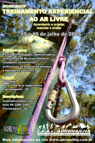 Há grande carência de profissionais habilitados para trabalhar com Treinamentos Experienciais ao Ar Livre (TEAL). Parte das empresas e profissionais que oferecem esse serviço ainda confunde TEAL com a simples realização de atividades na natureza. A partir da experiência da Adrenailha na elaboração de projetos personalizados para o desenvolvimento de competências por meio de TEAL, oferecemos oportunidade única no Estado de Santa Catarina para aperfeiçoamento de profissionais que atuam ou pretendem atuar com TEAL bem como para profissionais de Recursos Humanos que tenham interesse em aprender a avaliar propostas de TEAL que efetivamente agreguem valor na organização em que trabalham. Neste curso os participantes serão introduzidos aos principais aspectos relacionados à elaboração de projetos de TEAL, sua execução e avaliação. Oportunidade imperdível para psicólogos, profissionais de RH e educadores ao ar livre.